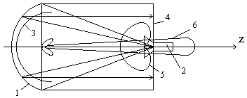 1 – зеркало, 2 – облучатель, 3 – сферический фронт волны облучателя, 4 – плоский фронт волны облучателя, 5 – диаграмма направленности облучателя, 6 – диаграмма направленности зеркала. Точечный облучатель (например, маленький рупор), расположенный в фокусе параболоида, создает у поверхности зеркала сферическую волну. Зеркало преобразует ее в плоскую, т.е. расходящийся пучок лучей преобразуется в параллельный, чем и достигается формирование острой диаграммы направленности. Поделитесь этой записью или добавьте в закладки |