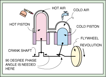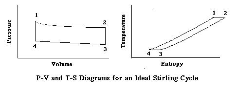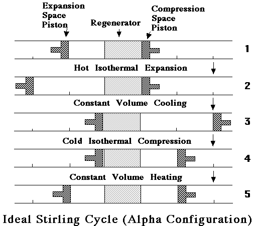 На диаграммах цифрами обозначены точки, разделяющие этапы работы двигателя. На первом этапе (1-2) происходит изотермическое расширение газа. Далее, на следующем этапе (2-3) - охлаждение при постоянном объеме. Далее (этап 3-4) - изотермическое сжатие охлажденного газа. И наконец на этапе 4-1 разогрев при постоянном объеме. Полезная работа производится газом только на первом этапе. Все остальные происходят за счет запасенной части энергии (обычно, энергии вращающегося колеса). Существуют два основных типа двигателей Стирлинга, отличающихся устройством цилиндров. В первом - так называемом двухцилиндровом (Two pistons type Stirling engine) используются раздельные цилиндры для нагревания и охлаждения рабочего газа.
