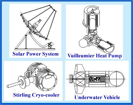 Перспективные применения двигателя Стирлинга. На первом из них показан пример солнечной энергетической установки (solar power system). Высокий к.п.д., простота и надежность конструкции двигателя Стирлинга обуславливают эффективность его использования в данных системах. Солнечный свет фокусируется вогнутыми зеркалами для разогрева двигателя (в качестве источника тепла). В роли охладителя может использоваться окружающий атмосферный воздух. Роль такого экологически чистого источника энергии в современном мире легко оценить. На втором рисунке схематически изображен тепловой насос Вуллемейера (Vuillemeier Heat Pump). Известно, что при использовании обратного цикла Срирлинга, т.е. если, например, приводить двигатель Стирлинга в движение с помощью какого-либо внешнего источника (например, еще одного двигателя Стирлинга), то "горячий" цилиндр будет охлаждаться, а "холодный" - разогреваться. Если при этом разогревать "горячий" цилиндр (например, окружающим воздухом), то "холодный" цилиндр будет разогреваться до более высокой температуры. При этом внешняя энергия расходуется не непосредственно на разогрев, а на "перекачку" тепла из холодного места в более теплое, что гораздо эффетивнее. Для идеального случая к.п.д.такой системы может быть посчитан как