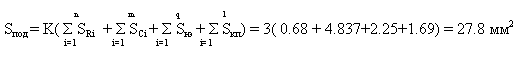 Расчет площади подложки сводится к определению суммы площадей резисторов, конденсаторов, навесных элементов, внутренних и всешних контактных площадок. Площадь платы, необходимая для размещения топологической структуры ИМС, определяют исходя из того, что полезная площадь платы меньше ее полной площади, что обусловлено технологическими требованиями и ограничениями. С этой целью принимают коэффициент запаса K, значение которого зависит от сложности схемы и способа ее изготовления составляет 2-3. Для данной схемы K=3.