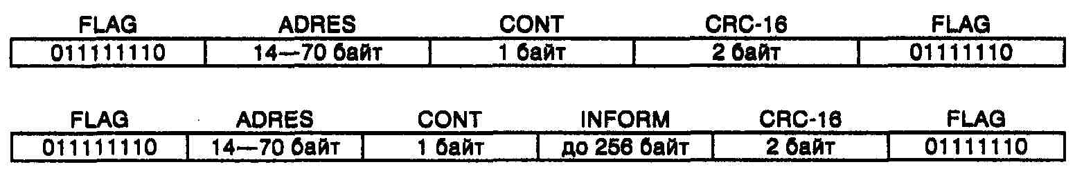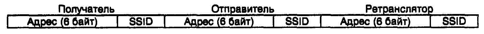 Начало и конец кадра отмечаются флагами FLAG, т.е. комбинациями вида <01111110>, что облегчает прием кадра на фоне помех. Поле адреса ADRES содержит адреса отправителя, получателя и станций-ретрансляторов, если таковые имеются. Размер адресного поля может составлять от 14 до 70 байт. Поле управления CONT определяет тип кадра: информационный или служебный. Служебные кадры, в свою очередь, могут подразделяться на суперви-зорные и ненумерованные. Супервизорные кадры служат для подтверждения приема неискаженных помехами кадров или для запроса повторной передачи искаженных кадров. Ненумерованные кадры предназначены для установления логического соединения и в случаях управления обменом в сети. Длина информационного поля INFORM, представляющая собой пакет сетевого уровня, в пакетных радиосетях обычно не превышает несколько сотен байт. Увеличение длины информационного поля приводит к повышению вероятности поражения помехой и возрастанию времени ожидания передачи пакетов другими пользователями. При реализации сетевого (третьего) уровня протокола АХ.25 используется поле определения протокола, которое выступает как часть информационного поля и является необязательным. Контрольное поле кадра (CRC-16) предназначено для обнаружения ошибок в кадре при его передаче. Адресное поле может содержать от двух до десяти логических адресов. Простейшим случаем является адресное поле из двух адресов (два пользователя). Если пользователи находятся вне зона радиовидимости, то могут использовать радиомодемы других пользователей сети в качестве ретрансляторов. Таких ретрансляторов для одного логического канала может быть до восьми. Адреса ретрансляторов также присутствуют в адресном поле кадра. Таким образом поля адреса делится на три подполя: получателя, отправителя и ретранслятора. Формат адресного поля следующий: