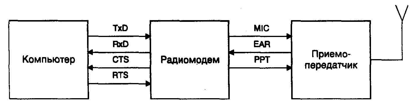 В таком режиме обеспечивается скорость передачи, равная 300 бит/с. В Европе обычно используется частота 1850 Гц для передачи "О" и 1650 Гц для "1". В У KB диапазоне чаще работают на скорости 1200 бит/с при использовании частотной модуляции с разносом поднесущих частот 1000 Гц. Принято, что "О" соответствует частота 1200 Гц, а "1" - 2200 Гц. Реже в диапазоне УКВ применяют относительную фазовую модуляцию (ОФМ). В этом случае достигаются скорости передачи 2400, 4800, а иногда 9600 и 19200 бит/с. В качестве примера на рис. 10.3 приведены фотографии, а в табл. 10.1 — сравнительные характеристики некоторых промышленно выпускаемых пакетных радиомодемов. 10.4. Применение радиомодемов Для успешного использования радиомодема необходимо правильное его подключение к компьютеру с одной стороны, и к радиостанции — с другой. Для подключения радиомодема к компьютеру при использовании последовательного интерфейса RS-232 необходимо обратить внимание на правильность (одинаковость) установки параметров обмена между компьютером и радиомодемом: скорость, размер информационного символа (7 или 8 бит), четность (Even — четный бит, Odd — нечетный, Mark — всегда 1, Space — всегда 0) и число стоповых бит (1, 1,5 или 2). Эти параметры в радиомодемах устанавливаются DIP-переключателями, реже перемычками или программно. Во многих современных моделях радиомодемов реализована автоматическая настройка на требуемую скорость обмена с компьютером. Особое внимание следует обратить на используемый протокол управления потоком: аппаратный или программный. При этом каждому из протоколов должен соответствовать свой соединительный кабель с соответствующей распайкой. Более подробная информация по этому вопросу была изложена в гл. 3. Радиомодем со встроенным контроллером является интеллектуальным устройством. Он выполняет множество функций и имеет свою систему команд. По этой причине не обязательно подключать к нему персональный компьютер, в простейшем случае достаточно терминала. Компьютер удобнее тем, что позволяет записывать в память принятую информацию, подготавливать к передаче данные и выполнять ряд других сервисных функций. Для совместной работы радиомодема и компьютера, последний необходимо перевести в режим терминала с помощью любой из доступных терминальных программ. Такие программы существуют для любых типов компьютеров. Наиболее известными терминальными программами для IBM PC-совместимых компьютеров являются TELIX, PROCOMM, МТЕ, QMODEM и т.д. Использовать можно любую из них. Существуют и специализированные терминальные программы для пакетной связи, например, PC-Pacratt — для Windows, Мас-RATT — для компьютеров Macintosh, COM-Pacratt — для компьютеров Commodore. Также разработаны и имеются в продаже программы передачи факсов в пакетных радиосетях. Это программы AEA-FAX, АЕА WeFAX и ряд других. Продаваемые радиомодемы, как правило, комплектуются дискетой с терминальной программой. Сдерживающим фактором применения для радиомодемов всего спектра программного обеспечения, разработанного для обычных модемов, является система команд управления радиомодема, отличная от набора АТ-команд. Единого рецепта для подключения радиомодемов и радиостанций разных типов нет и быть не может. Однако можно сделать несколько общих замечаний. Наиболее просто подключить радиостанцию, имеющую разъем для выносной гарнитуры, — устройства, совмещающего ф