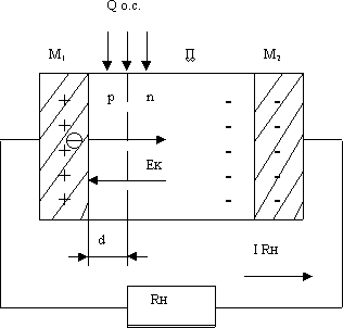 Рис.1. Принципиальная схема преобразователя. где: П – кристалл полупроводника (кремний n-типа); р-n – переход с контактным электрическим полем Ек; М 1 – металлический контакт с р-областью (алюминий); М 2 - металлический контакт с n-областью (алюминий); d – глубина залегания р-n перехода (не более 10 мКм); RH – сопротивление нагрузки внешней цепи. Принцип работы преобразователя заключается в следующем. Например, работа выхода электрона из полупроводника n-типа составляет 4,25 эВ, р-типа – 5,25 эВ, из алюминия – 4,25 эВ. Поэтому, контакт М 2 с полупроводником n-типа является оммическим и не влияет на работу преобразователя, а контакт М 1 с полупроводником р-типа является инжектирующим. Под действием сил теплового движения и в результате различия работ выхода, электроны из металлического контакта М 1 будут инжектироваться в р-область полупроводника. Часть электронов рекомбинирует с дырками р-области кристалла, а остальная часть электронов будет перебрасываться электрическим полем р-n перехода Ек в n-область кристалла. При этом n-область полупроводникового кристалла и контакт М 2 будут заряжаться отрицательно, а контакт М 1 , из-за ухода из него электронов, - положительно, что в итоге приведет к возникновению разности электрических потенциалов между контактами М 1 и М 2 . Поток электронов из М 1 в М 2 будет иметь место до тех пор, пока возрастающее электрическое поле между контактами не вызовет встречный поток электронов из n-области в р-область кристалла из-за снижения потенциального барьера р-n перехода. Когда эти токи электронов сравняются, в изолированном кристалле установится электрическое и термодинамическое равновесие. При этом между контактами М 1 и М 2 установится разность потенциалов равная половине контактной разности потенциалов p-n перехода (в данном случае – 0,55В), что означает наличие между ними Э.Д.С. (холостого хода). Если замкнуть контакты М 1 и М 2 внешним металлическим проводником с сопротивлением RH, то электрическое и термодинамическое равновесие полупроводникового кристалла нарушится и в цепи нагрузки потечет электрический ток I RH. При этом p-n переход будет охлаждаться, т. к. энергия электронов переходящих из р-области в n-область полупроводника будет увеличина за счет внутренней (тепловой) энергии кристаллической решетки полупроводника. Для поддержания в цепи нагрузки постоянного по величине тока к нему необходимо подводить теплоту от окружающей среды – Qo.c. Поделитесь этой записью или добавьте в закладки |