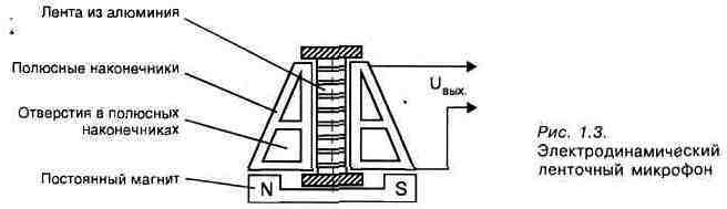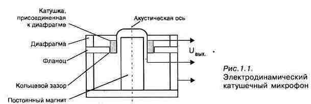 Микрофоны отличаются по способу преобразования колебаний звукового давления в колебания электрические. С этой точки зрения различают электродинамические, электромагнитные, электростатические, пьезоэлектрические, угольные и полупроводниковые микрофоны. Электродинамические микрофоны делятся на катушечные и ленточные. К электростатическим микрофонам относятся конденсаторные и электретные, широко используемые в профессиональных целях. Электромагнитные и пьезоэлектрические микрофоны не получили распространения в звукозаписи из-за узкого частотного диапазона и неравномерной частотной характеристики. Последние две группы микрофонов — угольные и полупроводниковые — из дальнейшего рассмотрения можно смело исключить, так как принципы их действия не обеспечивают выполнения ни одного из требований, предъявляемых к микрофонам для звукозаписи. Принципы действия микрофонов различных типов объединяет способ преобразования звуковых колебаний в электрические: мембрана (диафрагма) микрофона воспринимает и передает колебания звукового давления элементу, осуществляющему их преобразование в электрический сигнал. Общее представление об устройстве микрофонов, часто используемых для высококачественной звукозаписи можно получить из рис. 1.1—1.3. Принцип действия электродинамических микрофонов заключается в преобразовании колебаний звукового давления в механические колебания диафрагмы и связанной с ней катушки индуктивности (в катушечных микрофонах) или