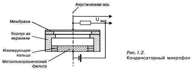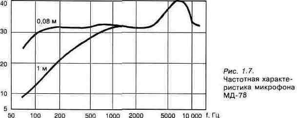 ленты (в микрофонах ленточных) в магнитном поле постоянного магнита. Это приводит к возникновению в катушке или ленте э.д.с. самоиндукции, в изменении которой и заложена информация. Конденсаторные микрофоны требуют внешнего источника питания. Жестко натянутая мембрана под действием изменяющегося звукового давления совершает колебательные движения относительно неподвижного электрода. Эти два элемента составляют конденсатор, являясь его обкладками. При колебаниях мембраны емкость конденсатора изменяется с частотой воздействующего на мембрану звукового давления. В электрической цепи появляется переменный ток, пропорциональный звуковому сигналу. Электретные микрофоны по принципу действия не отличаются от конденсаторных, однако эффективность преобразования сигнала в них выше, т. к. напряжение на обкладках конденсатора обеспечивается не только обычным внешним источником, но и электрическим зарядом мембраны или неподвижного электрода. Материал этих элементов обладает электретным свойством — способностью сохранять заряд длительное время. К основным характеристикам и параметрам микрофонов, определяющим их качество, относятся следующие: > Чувствительность — отношение напряжения на выходе микрофона к воздействующему на него звуковому давлению. > Динамический диапазон — разность между уровнями предельного звукового давления и собственных шумов. > Рабочий частотный диапазон. > Частотная характеристика (ЧХ). > Характеристика направленности — зависимость чувствительности микрофона от угла между его акустической осью и направлением на источник звука. Важными параметрами микрофона являются также уровень собственных шумов и выходное сопротивление. Очевидно, хороший микрофон должен быть малошумящим. Выходное сопротивление микрофона должно соответствовать входному сопротивлению аппаратуры, к которой он подключен.