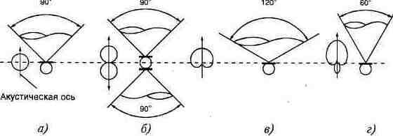 Рис. 1.4. Виды характеристик направленности микрофонов Двусторонне направленные микрофоны обладают одинаковой чувствительностью как с фронтальной, так и с тыльной стороны. Диаграмма направленности напоминает цифру “8” (рис. 1.4, б) Односторонне направленные микрофоны чувствительны только к звуковым волнам, приходящим с фронтального направления. Их диаграмма направленности представляет собой кривую, носящую название “кардиоида” и действительно напоминающую сердечко (рис. 1.4, в).