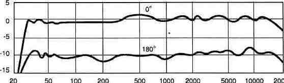 Рис. 1.8. Частотная характеристика микрофона МКЭ-2 На рис. 1.8 показана зависимость чувствительности микрофона МЭК-2 от частоты для фронтального (0°) и противоположного ему тылового (180°) направлений. Из рис. 1.7 видно, что осевая частотная характеристика микрофона МД-78 сильно зависит от расстояния, на котором микрофон находится от источника звука. Сравнивая рис. 1.7 и 1.8, можно сделать вывод о том, что ЧХ электрет-ного микрофона существенно равномернее ЧХ микрофона динамического. Небольшую неравномерность ЧХ можно до некоторой степени скорректировать при обработке сигнала многочастотными узкополосными фильтрами с управляемыми параметрами — эквалайзерами. Такие фильтры, реализованные программным способом, имеются в составе звуковых редакторов. 1.1.2. Рекомендации по применению микрофонов При выборе микрофона следует учитывать как всю совокупность его технических характеристик, так и условия записи, поэтому конкретные рекомендации дать довольно трудно. Однако общие правила выбора микрофона все же существуют [38]. Ненаправленный микрофон можно применять при записи пения и музыки в сильно заглушенном помещении. Его же следует использовать для передачи общей акустической обстановки при многомикрофонной записи. Односторонне направленный микрофон с характеристикой типа “кардиоида” желательно применять при записи в помещении с большим количеством звуковых отражений. Применяют его и в том случае, когда в помещение, где проводят запись, проникают посторонние шумы. Микрофон следует устанавливать тыльной стороной к источнику звуковых помех. Такой микрофон рекомендуется использовать при широком фронте размещения исполнителей. Этот микрофон применяют при маловероятной в любительских условиях многомикрофонной записи для четкого разделения групп исполнителей, а также при размещении исполнителя близко к микрофону, чтобы снизить низкочастотные искажения, присущие в этом случае ненаправленному и двусторонне направленному микрофонам.