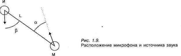 > углом а между прямой, проходящей через источник звука и микрофон, и акустической осью микрофона; > характеристикой направленности источника звука (углом (3 между прямой ИМ и акустической осью источника звука); > расстоянием между источником звука и микрофоном L. Все музыкальные инструменты по характеристикам направленности можно разделить, хотя и довольно условно, на три группы: ?" инструменты, обладающие выраженной направленностью, например, медные духовые инструменты; > инструменты, не обладающие заметной направленностью, к ним относятся ударные; > инструменты, занимающие промежуточное положение между первыми двумя группами. Эта группа инструментов наиболее многочисленна. Параметры а, р и L (рис. 1.9) определяют уровни сигналов, приходящих к микрофону, тембры источников звука, соотношение между уровнями полезного и мешающих сигналов. При повороте микрофона вокруг своей оси и увеличении угла а из-за отличия формы диаграммы направленности от круговой происходит изменение уровня записываемого сигнала. Аналогичным образом влияет и увеличение угла р. Изменение любого из этих двух углов приводит к завалу высших частот, что сказывается на тембре записываемого звука. Особенно сильно это проявляется в заглушенных помещениях и в случаях, когда расстояние L мало, т. к. основное значение имеет прямой звук, энергия которого в точке М меняется значительно. При больших L или при использовании гулкого помещения доля отраженных звуковых волн, попадающих в микрофон, достаточно велика, и поэтому частотные искажения менее заметны. Для ленточного микрофона, у которого характеристика направленности почти не зависит от частоты, изменение угла а не приводит к частотным искажениям. Наилучшие условия для записи будут в том случае, когда ее = 0 и р = 0. При записи с нескольких микрофонов необходимо заботиться об их фазиро-вании: сигналы с микрофонов не должны попадать в тракт записи в противо-