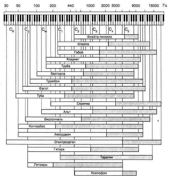Рис. 1.10. Частотные диапазоны некоторых музыкальных инструментов Частотные диапазоны обертонов инструментов показаны на рисунке серыми полосами. Особое звучание того или иного инструмента определяется распределением амплитуд всех частот — и основных, и обертонов. Относительная мощность звуковых колебаний, излучаемых инструментами в различных участках частотного диапазона неодинакова. Большинству музыкальных инструментов присуще усиление основных частот или обертонов в определенных относительно узких полосах частот. В таких случаях говорят о наличии формант в спектре частот инструмента. Объясняется это резонансными свойствами элементов конструкции музыкальных инструментов. Для каждого инструмента формантные области занимают свои специфические