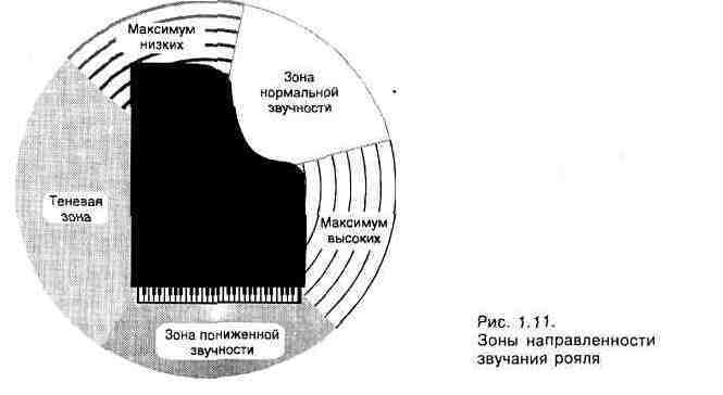 Возможно, многие будут удивлены, но к группе деревянных духовых инструментов причисляют и саксофон, хотя, глядя на переливающийся всеми цветами радуги и сверкающий явно металлическим блеском инструмент, этого и не скажешь. Тем не менее, это так. Изобретатель этого столь популярного ныне инструмента, бельгиец А. Сакс, в свое время поставил перед собой цель создать музыкальный инструмент, занимающий промежуточное положение между деревянными и медными духовыми [З]. Для осуществления этой идеи он соединил в одном инструменте коническую трубку с клапанным механизмом гобоя и тростью кларнета. В дальнейшем появилось целое семейство саксофонов различных размеров, обладающих различными тембрами: сопрани-но, сопрано, альт, тенор, баритон, бас и контрабас. Саксофон имеет довольно широкий диапазон частот и обладает большей, по сравнению с остальными деревянными духовыми инструментами, силой звука. В звучании саксофона заметна вибрация. При записи звучания саксофона следует учитывать, что звук идет из отверстий на теле инструмента, прикрываемых клапанами, а звуки самых нижних частот испускаются в основном из раструба. Микрофон следует располагать на расстоянии 1—1,5 м. Наиболее популярны инструменты, входящие в группу медных духовых — труба и тромбон. Труба обладает самым ярким по тембру звучанием среди инструментов медной духовой группы. При громкой игре в верхнем регистре она хорошо слышна даже на фоне мощно звучащего оркестра. При тихой игре или игре с сурдиной ее можно размещать вблизи микрофона. В общем случае из-за сильно выраженной направленности ее следует размещать сбоку от оси микрофона. Тромбон обладает более низким по регистру звучанием, чем труба. Громкость звучания особенно велика в диапазоне от 2 000 до 3 000 Гц. Так как в этом диапазоне находится максимум спектральной чувствительности уха, то при одновременной записи нескольких инструментов тромбон желательно располагать в стороне от микрофона и на достаточном расстоянии от него. Из инструментов, не входящих в оркестровые группы, рассмотрим лишь р о яль. Его важнейшей частью, определяющей акустические свойства инструмента, является резонансная дека, установленная под струнами и рамой, вклеенная краями в корпус инструмента. Звуки рояля издаются в основном верхней стороной деки и после отражения от крышки инструмента направлены преимущественно параллельно струнам. Однако общая направленность инструмента зависит от частоты звука и особенно ощущается при больших расстояниях до микрофона. У рояля различают несколько характерных зон направленности (рис. 1.11). При записи микрофон следует устанавливать, как правило, в зоне нормальной звучности. Необходимо экспериментальным путем выбрать такое положение микрофона в рабочей зоне, чтобы уравновесить интенсивность звучания партий левой и правой рук исполнителя. Обычно микрофон устанавливают на