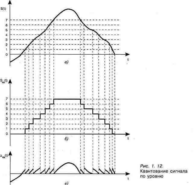 ности, возникающие в результате замены аналогового сигнала рядом квантованных по уровню отсчетов, можно рассматривать как его искажения, вызванные воздействием помехи. Эту помеху принято образно называть шумом квантования. Шум квантования (рис. 1.12, в) представляет собой разность соответствующих значений реального (рис. 1.12, а)и квантованного по уровню (рис. 1.12, б) сигналов. Из рис. 1.12 видно, что в случае превышения сигналом значения самого верхнего уровня квантования (“старшего” кванта), а так же в случае, когда значение сигнала оказывается меньше нижнего уровня квантования (“младшего” кванта), т. е. при ограничении сигнала, возникают искажения (рис. 1.12, д), более заметные по сравнению с шумом квантования. Для исключения искажений этого типа динамические диапазоны сигнала и АЦП должны соответствовать друг другу: значения сигнала должны располагаться между уровнями, соответствующими младшему и старшему квантам.