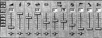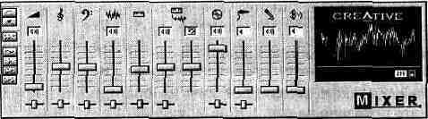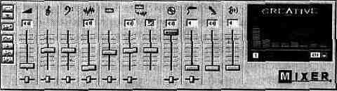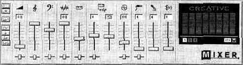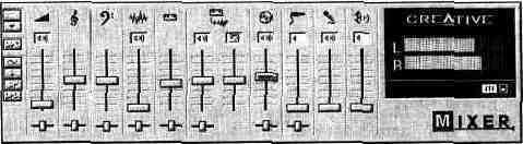 регулятор уровня громкости сигнала с выхода ЦАП; регулятор уровня громкости сигнала с выхода синтезатора; регуляторы уровней громкости и реверберации при генерации звука программно реализованным синтезатором, имеющимся только в SB AWE64 и SB AWE64 Gold (дополнительные 32 голоса); регулятор уровня воспроизведения сигнала с CD-плейера; регулятор уровня сигнала, поступающего с линейного стереовхода; регулятор уровня сигнала, поступающего с микрофонного входа; регулятор громкости громкоговорителя PC. Под всеми регуляторами уровней (кроме трех) находятся горизонтально перемещающиеся движки регуляторов стереобаланса. Над каждым из регуляторов уровня расположены кнопки, с помощью которых можно подключить или отключить соответствующий сигнал (довольно часто случайное нажатие этих кнопок служит основанием для паники и подозрений на неработоспособность звуковой карты). Правую часть микшера занимает окно, имитирующее многофункциональный жидкокристаллический индикатор. Для того чтобы он “ожил”, следует нажать на расположенную под ним правую кнопку.