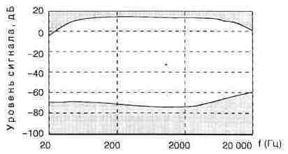 записи так, чтобы даже при самых сильных “всплесках” громкости не происходило бы перегрузки. Вот здесь-то и появляется второе “но”. Но тогда большая часть записи будет слишком тихой, настолько тихой, что самые слабые звуки просто не будут слышны, они сольются с шумами электронных приборов и носителя записи сигнала. Именно здесь и пересекаются проблемы борьбы с шумами и перегрузками. За много лет до того, как впервые прозвучало словосочетание “звуковая карта”, аналогичные проблемы были вынуждены решать разработчики магнитофонов, аппаратуры озвучивания кинофильмов, а затем и вообще звуко-усилительных устройств студий и концертных залов. В результате настойчивых изысканий было предложено несколько способов решения проблемы, которые отличаются деталями, но имеют общую сущность. Идея очень проста, и может быть выражена буквально одной фразой: для того чтобы не происходило ни перегрузки тракта сильными сигналами, ни маскирования слабых сигналов шумами, следует слабые сигналы усиливать, а сильные ослаблять, т. е. сужать динамический диапазон. Сужение динамического диапазона перед записью сигнала обеспечивает прибор, называемый компандером. При воспроизведении записи для восстановления прежнего динамического диапазона используют прибор, носящий название экспандер. В рамках общей идеи шумоподавления придумано много конкретных методов и устройств, отличающихся друг от друга деталями. Некоторые методы предполагают деление всего спектра сигнала на несколько диапазонов и раздельную регулировку уровня различных спектральных составляющих. Методы отличаются и алгоритмами вычисления пороговых уровней, после сравнения с которыми вырабатывается решение о том или ином преобразовании сигнала. Так, например, наиболее распространенная система шумопонижения типа Dolby А позволяет существенно улучшить эффективность магнитных и оптических носителей аналоговых записей и систем связи, служащих для передачи звуковых программ [78]. Система Dolby А основана на принципе компан-дирования, но только для сигналов низкого уровня и раздельно в четырех частотных поддиапазонах. В каждом из поддиапазонов определяется общий уровень частотных составляющих сигнала. Если он оказывается ниже порогового значения, то в процессе записи сигнал усиливается, а при воспроизведении, наоборот,ослабляется. Система Dolby А базируется на полученном экспериментально так называемом спектральном окне аналоговой ленты. Вид спектрального окна представлен на рис. 1.25. По сути, на рисунке наглядно представлена область допустимых значений уровней спектральных составляющих звукового сигнала в зависимости от их частот. Закрашенная область в нижней части рисунка соответствует собственным