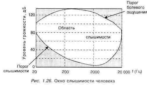 Рис. 1.25. Спектральное окно аналоговой магнитной ленты шумам ленты. Закрашенная область в верхней части рисунка — область значительных нелинейных искажений. При записи сигнала, используя систему шумоподавления, следует стремиться к тому, чтобы значения спектральных составляющих находились в незакрашенной области рисунка. Поскольку ныне применяются цифровые носители записи, практически свободные от того, что принято называть собственными шумами, изменяются и подходы к шумоподавлению. На первый план теперь выдвигаются ограничения, обусловленные не свойствами материала носителя записи, а особенностями слухового аппарата человека. Новая система шумопонижения Dolby SR, основанная на так называемом принципе наименьшего воздействия, учитывает не только спектральное окно носителя, но и окно слышимости человека, представленное на рис. 1.26. Верхняя граница окна соответствует оглушительному звуку, соседствующему с болевым ощущением. Нижняя граница определяется порогом слышимости. Алгоритмы обработки звука строятся с таким расчетом, чтобы максимально ослабить те шумы, которые попадают в окно слышимости, и игнорировать шумы, которые не слышны человеку.