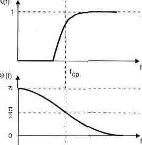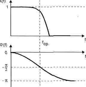 Рис. 1.27. АЧХ и ФЧХ фильтра нижних частот В зависимости от расположения полосы пропускания на оси частот фильтры подразделяются на: > фильтры нижних частот (ФНЧ), типичные АЧХ и ФЧХ которых показаны на рис. 1.27; > фильтры верхних частот (ФВЧ), их АЧХ и ФЧХ показаны на рис. 1.28; > полоснопропускающие (полосовые) фильтры (рис. 1.29); > полоснозадерживающие (режекторные) фильтры (рис. 1.30). Информация о характеристиках фильтров понадобится при прочтении гл. 3. На рис. 1.27—1.30 по горизонтали отложено значение частоты, а по вертикали — значения передаточных функций K(f) или фазовых сдвигов (p(f) в зависимости от частоты.