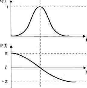 Рис. 1.29. АЧХ и ФЧХ полосового фильтра Приведенные выше характеристики являются идеализированными; реальные фильтры, строго говоря, не позволяют обеспечить равенство передаточной функции нулю. Колебания в полосе подавления, пусть и значительно ослабленные, все равно проникают через фильтр. Весьма распространенной ошибкой при использовании фильтров для обработки сигналов является пренебрежение учетом влияния на форму сигнала фазо-частотной характеристики фильтра. Фаза важна потому, что сигнал, прошедший через фильтр без изменения амплитуды в полосе пропускания, может быть искажен по форме, если временное запаздывание при прохождении через фильтр не будет постоянным для разных частот. Одинаковое время задержки соответствует линейной зависимости фазы от частоты. Из рис. 1.27—1.30 видно, что для ФНЧ и ФВЧ зависимость фазы от частоты можно считать линейной лишь в окрестностях частот среза, а для полосового фильтра — в окрестностях резонансной (центральной) частоты.