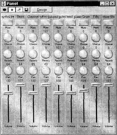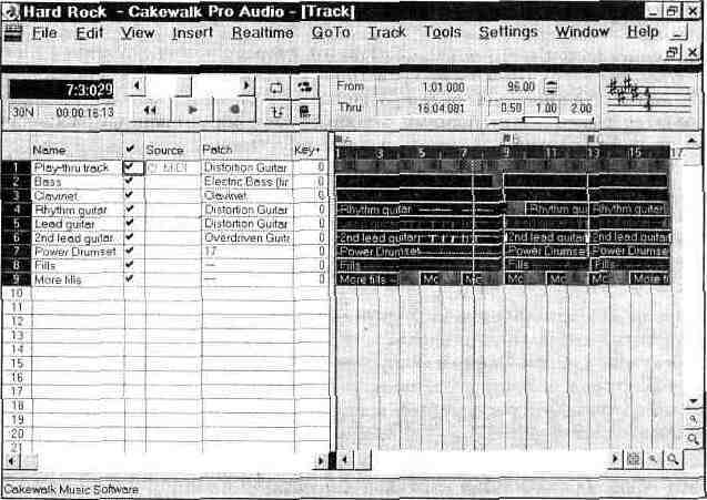 > Инструменты, обладающие мощным низким звуком, и барабаны лучше панорамировать в центр, малые барабаны также звучат лучше, когда их располагают поближе к середине, томы и тарелки можно расставить по панораме, но не слишком широко. ^ Лидер-вокал лучше выставить поближе к центру, так как именно на нем концентрируется основное внимание слушателей. Для него целесообразно выбрать крупный звуковой план. С панорамированием аккомпанирующего вокала можно поэкспериментировать. Для него естественными будут средний или удаленный звуковые планы. > Если нужно переместить инструмент с середины стереобазы, то не обязательно помещать его в одно из крайних положений. Можно попытаться раскрасить картину звуками, которые размыты в пространстве различными способами, но при этом основные источники должны размещаться поближе к середине. > Не следует панорамировать инструмент настолько широко, что впоследствии у слушателей создастся впечатление, будто инструмент занимает всю сцену. > Сигналы, обработанные стереоэффектами (такими как хорус или ди-лэй), лучше панорамировать не по всей стереобазе, а хотя бы от одного крайнего положения до середины. > При панорамировании MIDI-инструментов звуковых карт следует учитывать наличие определенного панорамирования некоторых из них, проведенного на этапе создания сэмплов. Достоинством звуковых редакторов, кроме всего прочего, является возможность очень точного управления звуковым планом каждого реального или электронного источника звука. Для компьютерных методов обработки деление пространства на три звуковых плана слишком грубо. В интервью, опубликованном в журнале “Компьютерра”, композитор Эдуард Артемьев сказал так: “Звук — генератор пространства. Пространство начинает работать как отдельная категория, и мы уже следим не за звуком, а за пространством” [б]. Этой цитатой мы и завершим раздел, посвященный звуковым планам. Микширование MIDI-треков в Cakewalk Pro Audio 6.0 Конечно же, для того чтобы организовать настоящую студию звукозаписи, неплохо бы иметь реализованный аппаратно микшер, подключенный ко входам высококачественной платы оцифровки звука. Сейчас предложение продавцов звукотехнической аппаратуры существенно превышает спрос. Чего только нет! Но все очень дорого. Поэтому в домашних условиях, до тех пор, пока звукозапись не станет окупающим себя источником ваших доходов, можно обойтись и минимумом средств, реализованных в звуковой карте. Функции и возможности микшера звуковых карт семейства AWE мы рассмотрели в разд. 1.2.4. Там же мы отметили слабые стороны этих устройств, ос-