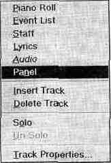 Рис. 7.32. Всплывающее меню секции треков мощью которого можно не только изменить вид и состав уже существующих модулей микшера, но и сконструировать новые модули, объединяющие в произвольном сочетании органы регулировки параметров любых каналов. Поэкспе-риментировав с предустановками, вы обнаружите образы панелей микшеров самых известных фирм. По умолчанию каждая линейка содержит ползунковый регулятор громкости, рукоятки регулировки панорамы, реверберации и хоруса. Кнопка Mute служит для отключения звучания канала. Кнопки, расположенные в верхней части окна