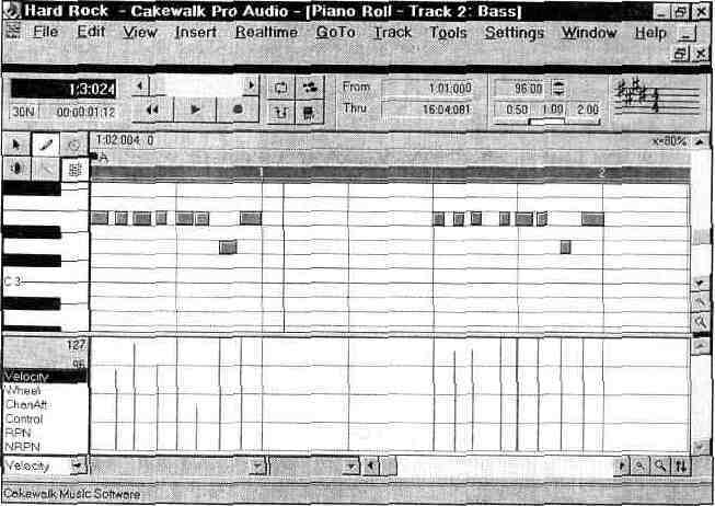 Окно Piano Roll no вертикали разделено на два поля. В верхнем поле действительно можно видеть отпечатки нажатых клавиш. Ныне это один из общепринятых способов отображения музыки, записанной с помощью музыкальных редакторов. Нижнее поле предназначено для графического управления параметрами манипуляторов. Уровень параметра соответствует высоте вертикальных столбиков, совпадающих во времени с началами нот. Перечень редактируемых параметров содержится в списке, расположенном в левом нижнем углу окна, и открывается щелчком мыши. На рис. 1.34 показано, что выбран и отображается параметр Velocity, определяющий уровень громкости звучания музыкального инструмента, закрепленного за данным треком. Используя инструменты (карандаш и ластик), приводимые в действие нажатием соответствующих кнопок, расположенных над изображением клавиатуры, можно рисовать столбики любой высоты, задавая тем самым любой закон изменения отображаемого параметра. Существует еще один способ управления параметрами любых эффектов. Правда, он не столь нагляден, как предыдущий, но именно он и является основным. Микшер и графики — это всего лишь программные надстройки над ним. Речь идет об управлении параметрами с помощью MIDI-сообщений. Удобным инструментом для редактирования списка MIDI-сообщений и записи новых является окно диалога Event List. Можно открыть окно, в котором будут в хронологическом порядке размещены абсолютно все сообщения. Но это же можно сделать и для каждого из треков. Для того чтобы открыть список сообщений для отдельного трека, необходимо в секции треков окна Track (рис. 1.31) щелкнуть правой кнопкой мыши по желаемому треку. В появившемся всплывающем меню (рис. 1.32) выберите команду Event List. После этого откроется одноименное окно, изображенное на рис. 1.35.