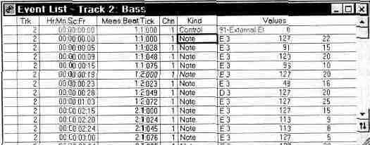 Рис. 7.35. Окно Event List для редактирования MIDI-сообщений Каждая строка таблицы окна Event List содержит одно сообщение. В приведенном примере почти все сообщения относятся к типу Note и означают, что в такой-то момент следует включить такую-то ноту инструмента, закрепленного за первым MIDI-каналом. Лишь верхняя строка содержит сообщение управления манипулятором (контроллером). Громкостью звучания