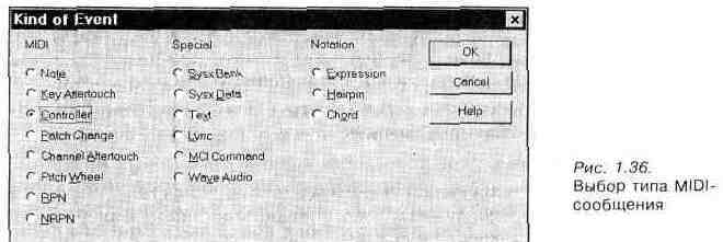 нот можно управлять, изменяя числа, записанные во втором столбце справа. Значением остальных параметров следует управлять, посылая соответствующие сообщения. Для этого нужно щелкнуть левой кнопкой мыши по той строке, куда вы намерены вставить сообщение. При этом откроется окно диалога Kind of Event (рис. 1.36), предназначенное для выбора типа сообщения. Из рис, 1.36 видно, что, кроме MIDI-сообщений, можно выбирать специальные сообщения и сообщения, относящиеся к нотации.