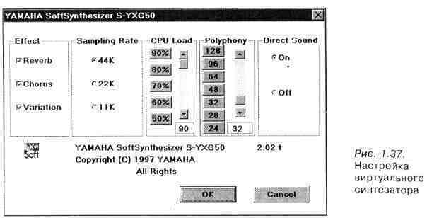синтезаторы звучат гораздо лучше! Что бы вы сказали, послушав звучание настоящего инструмента?” Возможно, мы не угадали... В качестве примера рассмотрим виртуальный синтезатор Yamaha S-YXG50. Не станем скрывать причины выбора именно этой программы. Во-первых, она просто нам симпатична. Кроме того, S-YXG50 использует технологии ММХ и Direct Sound, поддерживает стандарт GX. Приведем характеристики этой программы: > WT-синтезатор с банком инструментов объемом 2 Мбайт; > максимальная полифония 128 нот; )•* набор инструментов: 676 мелодических, 21 набор ударных инструментов и спецэффектов; > максимальная частота сэмплирования 44/22/11 кГц; ^ фильтр с динамически изменяемыми параметрами для каждой звучащей ноты; ')- эффекты: 8 типов реверберации, 8 типов хоруса, 36 типов вариаций. Технические требования, предъявляемые к PC: > процессор Pentium-166 или лучше (настойчиво рекомендуется процессор с технологией ММХ); > операционная система Windows 95; > ОЗУ объемом не менее 16 Мбайт; > 16-битная звуковая карта. Приведенные требования являются минимальными. Это означает, что на таком PC программа будет работать, но не обязательно на полную мощность, заявленную в ее характеристиках. Пользователю предоставляется возможность настройки виртуального синтезатора в соответствии с производительностью своего компьютера. После установки на PC программа идентифицируется системой как MIDI-yc-тройство. Вы можете использовать это виртуальное устройство в музыкальном редакторе точно так же, как использовали бы настоящий синтезатор. О присутствии программного синтезатора в системе свидетельствует появление в Панели управления Windows новой иконки. Щелчком по этой иконке вызывается окно настроек драйвера виртуального синтезатора, изображенное на рис. 1.37. Рассмотрим опции этого окна. В группе Effect можно включать или выключать типы эффектов, которые поддерживаются синтезатором. Конечно, хорошо, когда включены все эффекты, но для этого требуется мощный процессор. Отключив один или два (или все три) типа эффектов, можно существенно снизить требования программы к вычислительным ресурсам процессора.