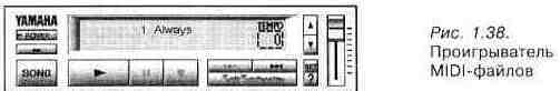 Sample Rate — частота сэмплирования. Здесь комментарии излишни: чем больше, тем лучше (лишь бы процессор смог справиться с этой задачей). CPU Load — допустимая загрузка (занятость) процессора. Наилучшая допустимая загрузка с точки зрения качества синтезируемого звука — 90 %. Но процессорного времени для других программ при воспроизведении музыки останется очень мало. При такой загрузке маломощного процессора выполнение параллельно запущенных программ может попросту остановиться. Polyphony — максимальная полифония. Группа Direct Sound содержит всего два переключателя, позволяющих подключать или отключать звуковые драйверы Microsoft DirectX, благодаря которым можно более эффективно использовать аппаратное обеспечение и меньше загружать процессор. Нельзя не упомянуть о симпатичном проигрывателе MIDI-файлов, поставляемом вместе с виртуальным синтезатором, а также о самих демонстрационных MIDI-файлах, использующих возможности стандарта XG. Вид проигрывателя показан на рис. 1.38.