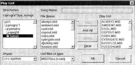 Рис. 1.39. Редактор списка файлов для воспроизведения В этой нехитрой панели вы, конечно, разберетесь и без нашей помощи. Вернемся в главное окно проигрывателя (рис. 1.38). Кроме стандартных кнопок управления и поля в стиле ЖК-индикатора с названием текущей музыкальной композиции, здесь имеются кнопки настройки проигрывателя (SET) и помощи (?), Нажав кнопку SET, вы вызовете окно диалога, возможный вид которого показан на рис. 1.40. В этом окне содержится список доступных MIDI-устройств. Выбрать можно только одно устройство. Оно и будет воспроизводить MIDI-файлы.