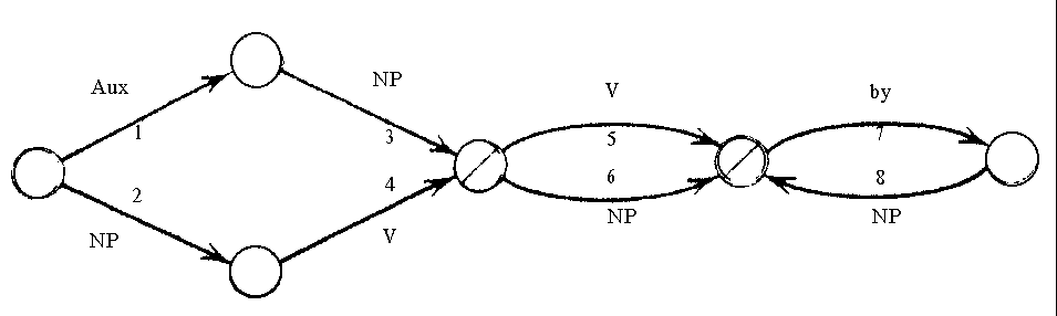 Разберем алгоритм работы сети на вышеприведенном примере. Анализ начинается слева, т. е. с первого слова в предложении. Словосочетание the rabbit проходит тест, который выясняет, что оно не является вспомогательным глаголом ( Aux , стрелка 1), но является именной группой ( NP , стрелка 2). Поэтому the rabbit кладется в ячейку Subj, и предложение получает признак TypeDeclarative , т.е. повествовательное , и система переходит ко второму узлу. Здесь дополнительный тест не требуется, поскольку он отсутствует в списке тестов, записанных на LISP. Следовательно, слово, стоящее после the rabbit - т. е. nibbles - глагол-сказуемое (обозначение V на стрелке), и nibbles записывается в ячейку с именем V . Перечеркнутый узел означает, что в нем анализ предложения может в принципе закончиться. Но в нашем примере имеется еще и дополнение the carrot , так что анализ продолжается по стрелке 6 (выбор между стрелками 5 и 6 осуществляется снова с помощью специального теста), и словосочетание the carrot кладется в ячейку с именем Obj . На этом анализ заканчивается (последний узел был бы использован в случае анализа такого пассивного предложения, как The carrot was nibbled by the rabbit ). Таким образом, в результате заполнены регистры (ячейки) Subj , Type , V и Obj , используя которые, можно получить какое-либо представление (например, дерево). Расширенная сеть переходов имеет свои недостатки: