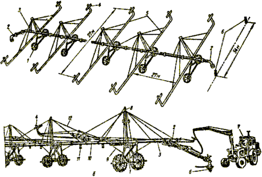 а - конструктивная схема; б - начальная часть; 1 - опорная тележка; 2 - подсоединительтельный трубопровод; 3 - водопроводящий трубопровод; 4 - дождевальные аппараты; 5 - фермы-открылки; 6 - гидранты; 7 - передвижная электрическая станция; 8 - мачта; 9 - стремянка; 10 - соединительная труба; 11 - сливной клапан; 12 - система раскрепляющих тросов