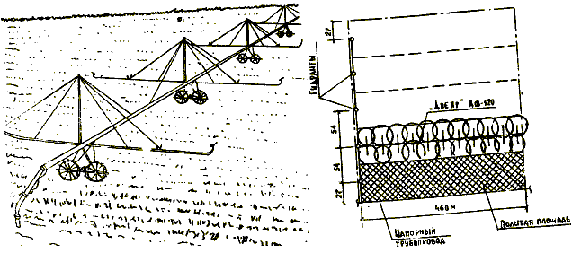 Дождевальный фронтальный с механизированным перемещением “Днепр” ДФ-120. “Днепр” ДФ-120 является одной из первых отечественных электрифицированных машин. Дождевальная машина ДФ-120 предназначена для полива зерновых и технических культур, лугов и пастбищ. Водопроводящий трубопровод машины расположен над поверхностью поля на расстоянии 2,1 м, что позволяет поливать и высокостебельные культуры. Машина ДФ-120 “Днепр” имеет фронтальное перемещение и работает позиционно. Основные конструктивные элементы машины “Днепр” отмечены на рис.1-2 Дождевальная машина “Днепр” состоит из водопроводящего пояса, расположенного на опорных тележках, ферм, на каждой из которых два среднеструйных дождевальных аппарата, передвижной электрической станции.