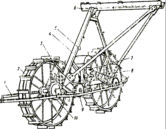 Рис. 3 Опорная тележка: 1 - стеблевод; 2 - колесо; 3 - ось; 4 - кожух мотор-редуктора; 5 - рама; 6 - желоб; 7 - мотор-редуктор; 8 - звездочка натяжная; 9 - цепная передача; 10 - передача зубчатая цилиндрическая. Опорная тележка представляет собой сварную пространственную раму из элементов трубчатого профиля, опирающуюся на два металлических колеса. Мощность мотор-редуктора каждой тележки 1,1 кВт, напряжение 230 В. Вращение колес осуществляется через пару цилиндрических зубчатых колес от промежуточного вала. Промежуточный вал, в свою очередь, приводится в движение от звездочек, расположенных на валу мотор-редуктора, при помощи цепных передач, смонтированных на тележке. Электроснабжение привода обеспечивается от электрогенератора с ходоуменьшением, установленного на тракторе ЮМЗ-6М, с номинальной мощностью 44 кВт. Электрогенератор приводится в движение от вала отбора мощности трактора. Напряжение в сети 220 В, частота 50 Гц. Для сохранения прямолинейности поливного трубопровода имеются специальные электрические синхронизирующие устройства с напряжением в сети 120 В, включающие конечные выключатели, магнитные пускатели и блоки ртутных переключателей. Механизм управления подсоединен ко всем тележкам, за исключением первой и последней. Выравнивание движения промежуточных тележек выполняется автоматическим механизмом синхронизации, изображенном на рис. 4.