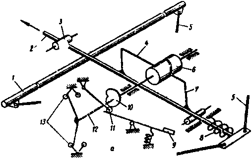 Рис. 4. Механизм управления машины “Днепр”: 1 - проводящий трубопровод; 2 - штанга; 3 - опорный ролик; 4 - трос; 5 - тяга штанги; 6 - барабан; 7 - подвеска; 8 - пружина; 9 - ртутный прерыватель; 10 - кулачок; 11 - рычаг сигнализирующего устройства; 12 - кулачковый вал; 13 - концевые выключатели. Стрелкой показано направление движения машины. Если какая-либо тележка опережает соседние, то штанга смещается относительно изогнувшегося водопроводящего трубопровода в сторону, противоположную направлению движения машины, и с помощью троса поворачивает барабан, а вместе с ним и кулачковый вал, выключая тем самым верхний конечный выключатель. Выключатель отключает магнитный пускатель двигателя-редуктора и тележка останавливается. После выравнивания трубопровода штанга под действием пружины смещается вперед по ходу движения машины, двигатель-редуктор включается и тележка вновь начинается двигаться. Если в результате нарушения работы электропривода тележки изгиб трубопровода становится недопустимым, то штанга поворачивает ртутный прерыватель и цепь размыкается. При этом на пульте управления гаснет лампочка и включается звуковой сигнал, требующий вмешательства машиниста-оператора.
