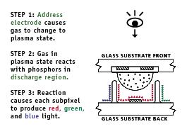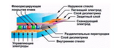 Принцип работы плазменной панели состоит в управляемом холодном разряде разреженного газа (ксенона или неона), находящегося в ионизированном состоянии (холодная плазма). Рабочим элементом (пикселем), формирующим отдельную точку изображения, является группа из трех субпикселей, ответственных за три основных цвета соответственно. Каждый субпиксель представляет собой отдельную микрокамеру, на стенках которой находится флюоресцирующее вещество одного из основных цветов (см. рис. 2). Пиксели находятся в точках пересечения прозрачных управляющих хром-медь-хромовых электродов, образующих прямоугольную сетку.