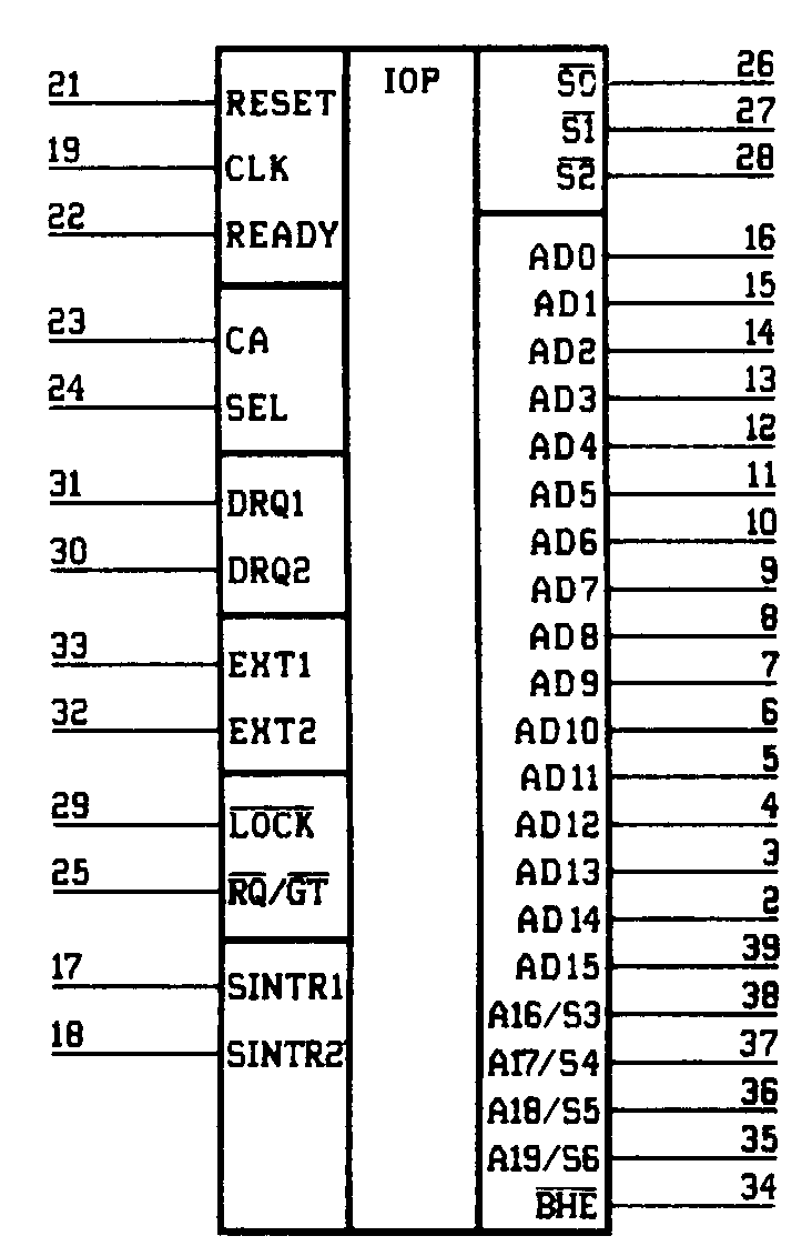 Микросхема К1810ВМ89 представляет собой однокристальный 20-битовый специализир о ванный процессор ввода — вывода (СПВ Б ), выполненный по высококачественной n-МОП -технологии [4, 5, 15 ]. Кристалл микросхемы размером 5,5*5,5 мм потребляет мощность не более 2.5 Вт от источника питания напряжением +5 В. Схема выпускается в 40-выводном корпусе. Синхронизуется однофазными импульсами с частотой повторения 1—5 МГц от внешнего тактового генератора. Процессор К1810ВМ89 (обозначаемый далее для краткости ВМ89) используется совместно с центральным процессором ВМ86\ВМ88, а также К580ВМ80. Он предназначен для повышения производительности систем на базе МПК К1810 благодаря освобождению ЦП от управления вводом — выводом и осуществлению высокоскоростных пересы лок с прямым доступам в память (ПДП пересылок). К основным функциям СПВ Б ВМ89 относятся инициализация и управление контроллерами внешних устройств, обеспечение гибких и универсальных пересылок с ПДП. Процессор может работать параллельно с ЦП одновременно по двум каналам ввода — вывода, каждый из которых обеспечивает скорость передачи информации до 1,25 Мбайт/с при стандартной тактовой частоте 5 МГц. Организация связи СПВВ с центральным процессором через память повышает гибкость взаимодействия и облегчает создание модульного программного обеспечения, что повышает надежность разрабатываемых схем. Процессор ВМ89 имеет два идентичных канала ввода — вывода, каждый из которых содержит 5 20-битовых, 4 16-битовых и один 4-битовый регистр. Взаимодействие каналов при параллельной работе осуществляется под управлением встроенной логики приоритетов. Процессор обеспечивает 16-битовую шину данных для связи с ОЗУ и портами В\В. Шина адреса имеет 20 линий, что позволяет непосредственно адресоваться к памяти емкостью до 1 Мбайт. Для экономии числа выводов БИС младшие 16 адресных линий мультиплексированы во времени с линиями данных и составляют единую локальную шину адреса/данных. Четыре старшие адресные линии аналогично мультиплексированы с линиями состояния СПВ Б . Чтобы сигналы этих линий можно было использовать в МПС, их обязательно демультиплексируют, либо с помощью тех же внешних схем, которые используются ЦП (в местной конфигурации), либо с помощью независимых схем (в удаленной конфигурации). Система команд СПВВ ВМ89 содержит 53 мнемокода, причем возможности и набор команд оптимизированы специально для гибкой, эффективной и быстрой обработки данных при вводе — выводе. СПВБ позволяет сопрягать 16- и 8-битовые шины и периферийные устройства. При использовании ВМ89 в удаленном режиме пользователь программно может определить различные функции шины СПВБ, легко сопрягая ее со стандартной шиной Multibus. Предельно допустимые условия эксплуатации БИС К1810ВМ89: температура окружающей среды 0...70 °С, напряжение на любом выводе относительно корпуса -0.3 ...+7В. Основные хар-ки по постоянному току при- ведены в табл. 1