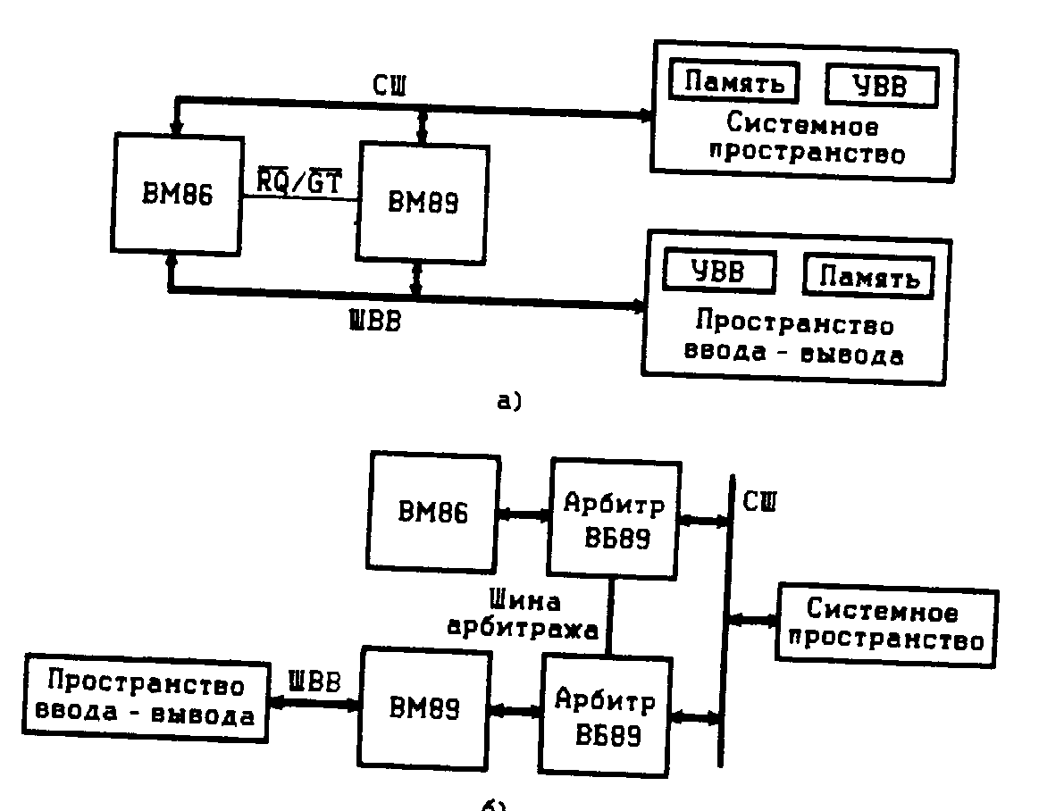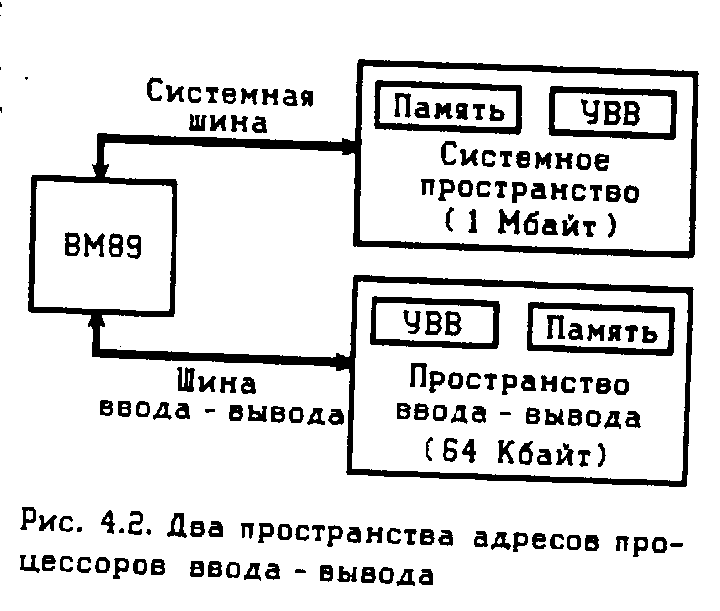 Внутренняя структура СПВВ подчинена его основному назначению - выполнять пересылки данных без непосредственного вмешательства ЦП, который связывается с СПВБ только для инициализации и выдачи задания на обработку. В обоих случаях ЦП предварительно готовит необходимое сообщение в памяти и затем с помощью сигнала запроса готовности канала активизирует СПВБ ВМ89 на выполнение действий, определенных в сообщении. С этого момента СПВВ работает независимо от ЦП. В процессе выполнения задания или по его завершении СПВБ может связаться с ЦП с помощью сигнала запроса прерывания. Процессор может обращаться к памяти и устройствам ввода — вывода (УВВ), размещенным в системном пространстве адресов емкостью 1 Мбайт или в пространство ввода – вывода ёмкостью 64 Кбайт (рис 4.2). Хотя СПВВ располагает только одной физической шиной данных, удобно полагать, что в системное пространство он обращается по системной шине (СШ) данных,