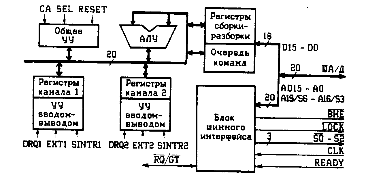 Арифметическое логическое устройство (АЛУ) может выполнять беззнаковые арифметические операции над 8- и 16-битовыми двоичными числами, включающими сложение, инкремент и декремент. Результатом арифметических операций может быть 20 - битовое число. Логические операции, включая И, ИЛИ, НЕ, могут выполняться над 8- и 16-битовыми операндами. Регистры сборки — разборки участвует при передаче всех данных, поступающих в процессор. Когда разрядность источника и приемника данных различаются, процессор использует эти регистры для обеспечения максимальной скорости передачи. Например, при пересылке с ПДП из 8- битового УВВ в 16-битовую память процессор затрачивает два цикла шины на прием двух последовательных байтов, “собирает” их в одно 16-битовое слово и передает его в память за один цикл шины. При передаче 16- битовых данных 8- битовому приемнику осуществляется его предварительная “разборка” на байты. Таким образом, наличие регистров сборки/разборки экономит циклы шины. Очередь команд используется для повышения производительности процессора при выборке их из памяти. Во время выполнения программы каналом команды выбираются из памяти словами, размещёнными по чётному адресу