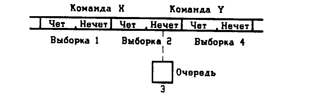Рис. 5. Выборка команд с использованием очереди младшего байта. На одну такую выборку затрачивается один цикл шины. Этот процесс показан на рис. 5. Если последний байт текущей команды Х приходится на чётный адрес, то следующий байт за ним байт из нечётного адреса (он является первым байтом команды Y) извлечённого слова в очереди. Когда канал начинает выполнять команду Y, этот байт из очереди извлекается значительно быстрее, чем из памяти. Таким образом, очередь команд размерностью всего один байт позволяет процессору при выборке команд всегда читать слова, что снижает загрузку шины, увеличивая ее пропускную способность и производительность СПВБ. В двух исключительных случаях при извлечении команд процессор читает из памяти байты, а не слова. Во-первых, когда команда передачи управления (например, JMP, JNZ, CALL) указывает на нечётный адрес, по которому размещена команда, требующая исполнения. В этом случае первый байт команды извлекается отдельно. Во-вторых, когда встречается 6-байтовая команда LPDI, которая извлекается в следующем порядке: байт — слово — байт — байт — байт, и очередь не используется. Когда используется 8-битовая шина для передачи команд процессору, читаются только байты, а очередь не используется и каждая выборка требует одного цикла шины. Блок шинного интерфейса (ВШИ) осуществляет управление и определяет циклы шины, связанные с выборкой команд и передачей данных между СПВВ и памятью или УВВ. Каждое обращение к шине связано с битом регистра этикеток (регистр TAG находится в каждом канале), который указывает, к какому пространству адресов (системному или ввода — вывода) относится обращение. БШИ выставляет тип цикла шины (выборка команды из пространства адресов ввода — вывода, запись данных в память системного пространства и т.д.) в виде кода состояния на выходах S2 — S0 (табл. 2). Системный контроллер К1810ВГ88 декодирует этот код, выбирая нужную шину (СШ/ ШВВ) и формируя соответствующую команду (чтение, запись и т.д.). Затем БШИ определяет соотношение между логической и физической шириной СШ и LLIBB. Физическая ширина каждой шины фиксирована в системе и сообщается процессору или его инициализации.