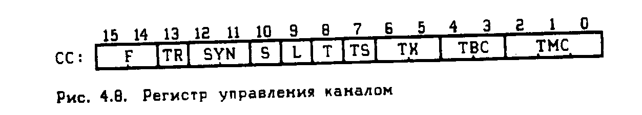 Однако делать это не рекомендуется, так как программа становится трудной для понимания. Указатель блока параметров РР загружается общим УУ начальным адресом блока параметров в процессе инициализации канала на выполнение задания. В подготовленном сообщении расположение блока параметров в памяти определяет центральный процессор (см. табл. 4). Программа канала не может изменить содержимое регистра PP. Его удобно использовать как базовый для пересылки данных в блок параметров. Для ПДП- пересылок регистр РР не используется. Индексный регистр IX используется программой канала как регистр общего назначения. Он может также использоваться в качестве индексного регистра для адресации операндов, находящихся в памяти. В качестве разновидности индексной адресации, с помощью IX можно задать индексную адресацию с автоинкрементном, которая очень удобна при обработке массивов данных. Для ПДП - пересылок регистр IX не используется. Счетчик байтов ВС в программе канала служит регистром общего назначения. При ПДП- пересылке подсчитывает число пересланных байтов путём декрементирования значения, загруженного перед ее началом. Если пересылка должна заканчиваться по заданному числу пересланных байтов, то УУ вводом — выводом закончит её, когда содержимое ВС станет равным нулю. Регистр маскированного сравнения МС в программе канала может использоваться как регистр общего назначения или для маскированного сравнения. При ПДП- пересылке используется для маскированного сравнения. Маскированное сравнение позволяет сравнить выделенные разряды байта (операнда команды или пересылаемого байта) с заданным заранее значением. Для этого в старший байт МС загружается маска, выделяющая интересующие разряды, а в младший—сравниваемое значение (рис. 7). В программе, при выполнении команды условного перехода по маскированному сравнению (либо при ПДП- пересылке), определенный в ней операнд (либо пересылаемый байт) сравнивается с замаскированным значением. Регистр управления каналом СС используется в основном при ПДП- пересылках. Он служит для определения условий пересылки и указывает способ её окончания. Структура и обозначение управляющих полей СС представлены на рис. 8. Пять старших полей определяют условие ПДП- пересылки: F (пересылка) определяет, откуда и куда пересылаются данные; TR (перекодировка) — следует ли пересылаемые данные перекодировать; SYN (синхронизация) — способ синхронизации пересылки; S (источник) — в каком регистре (GA или GB) находится адрес источника; L (монополизация) — следует ли активизировать сигнал во время пересылки. Четыре младших поля задают способ окончания пересылки: TS указывает, что пересылка состоит в передаче только одного данного; ТХ—что пересылка должна заканчиваться по внешнему сигналу (ЕХТ); ТВС — по нулю в счетчике байтов (ВС); TMC — по результатам маскированного сравнения.