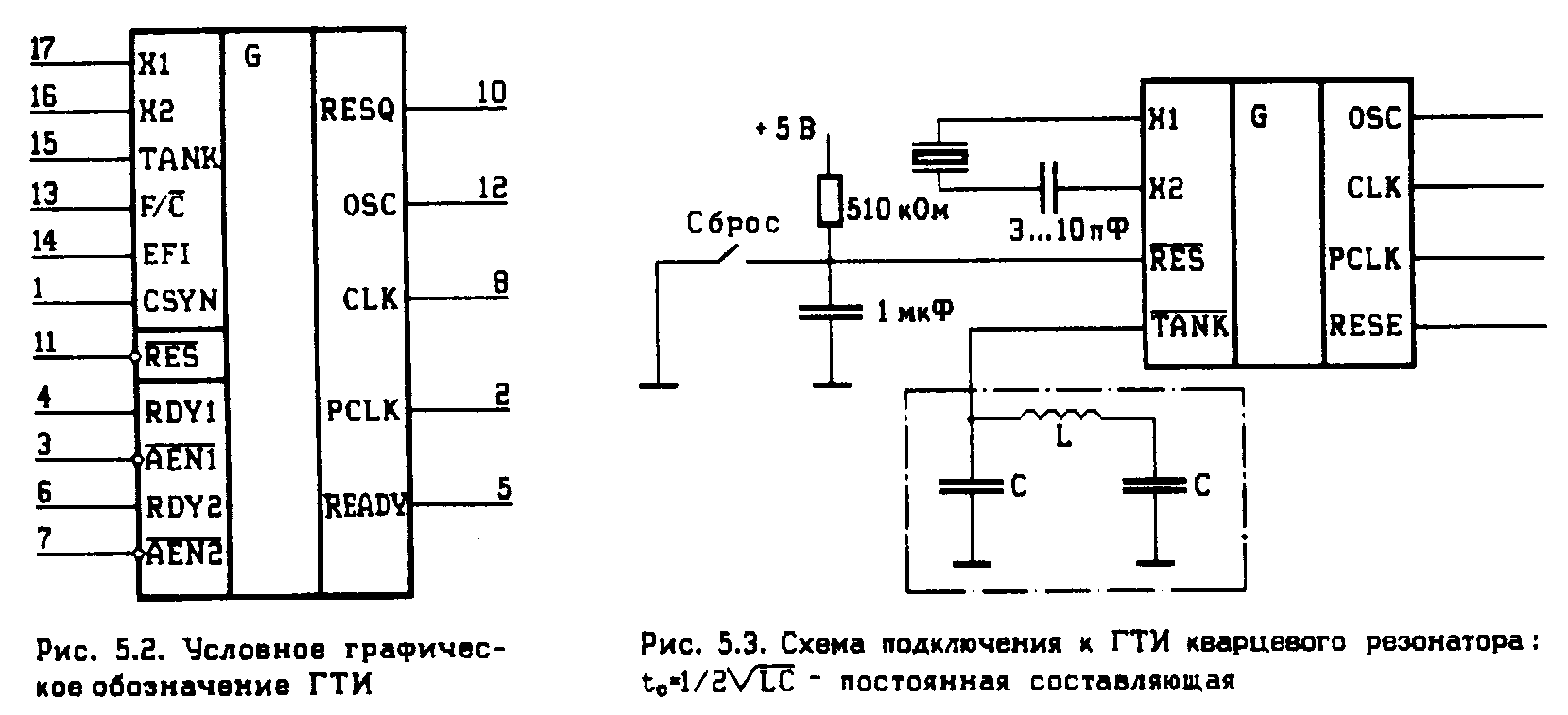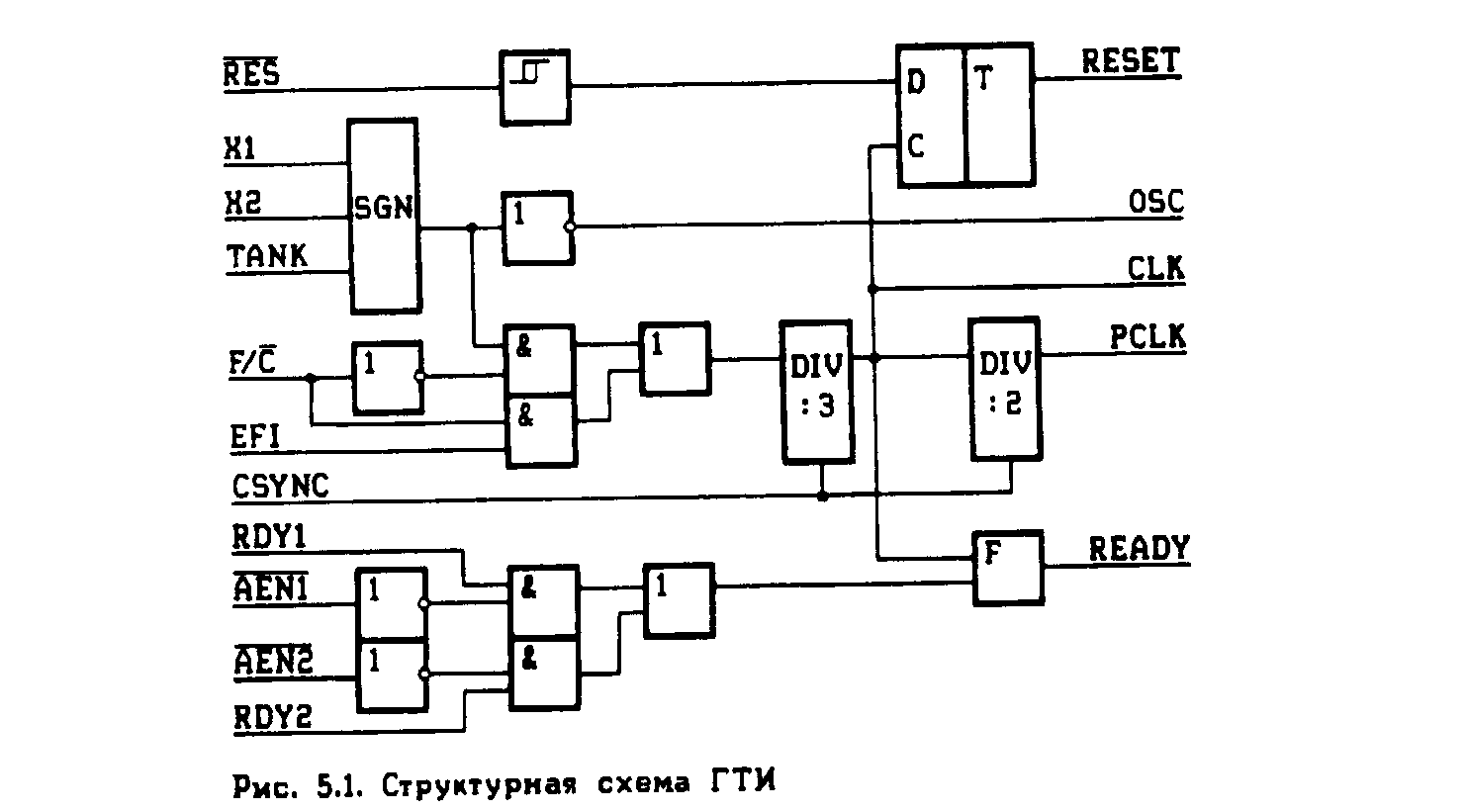 Генератор тактовых импульсов (ГТИ) КР1810ГФ84 предназначен для управления ЦП КР 1810ВМ86 и периферийными устройствами, а также для синхронизации сигналов READY с тактовыми сигналами ЦП и сигналов интерфейсной шины Multibus. Генератор тактовых импульсов (рис. 11, 12) включает схемы формирование тактовых импульсов (OSR, CLK, CLK) , сигнала сброса (RESET) и сигнала готовности (READY); Cхема формирования тактовых импульсов вырабатывает сигналы: CLK,-тактовой частоты для управления периферийными БИС, OSC — тактовой частоты задающего генератора, необходимые для управления устройствами, входящими в систему, и для синхронизации. Сигналы синхронны, их частоты связаны соотношением: Eefi = 3FCLK= 6Fpclk режиме внутреннего генератора.