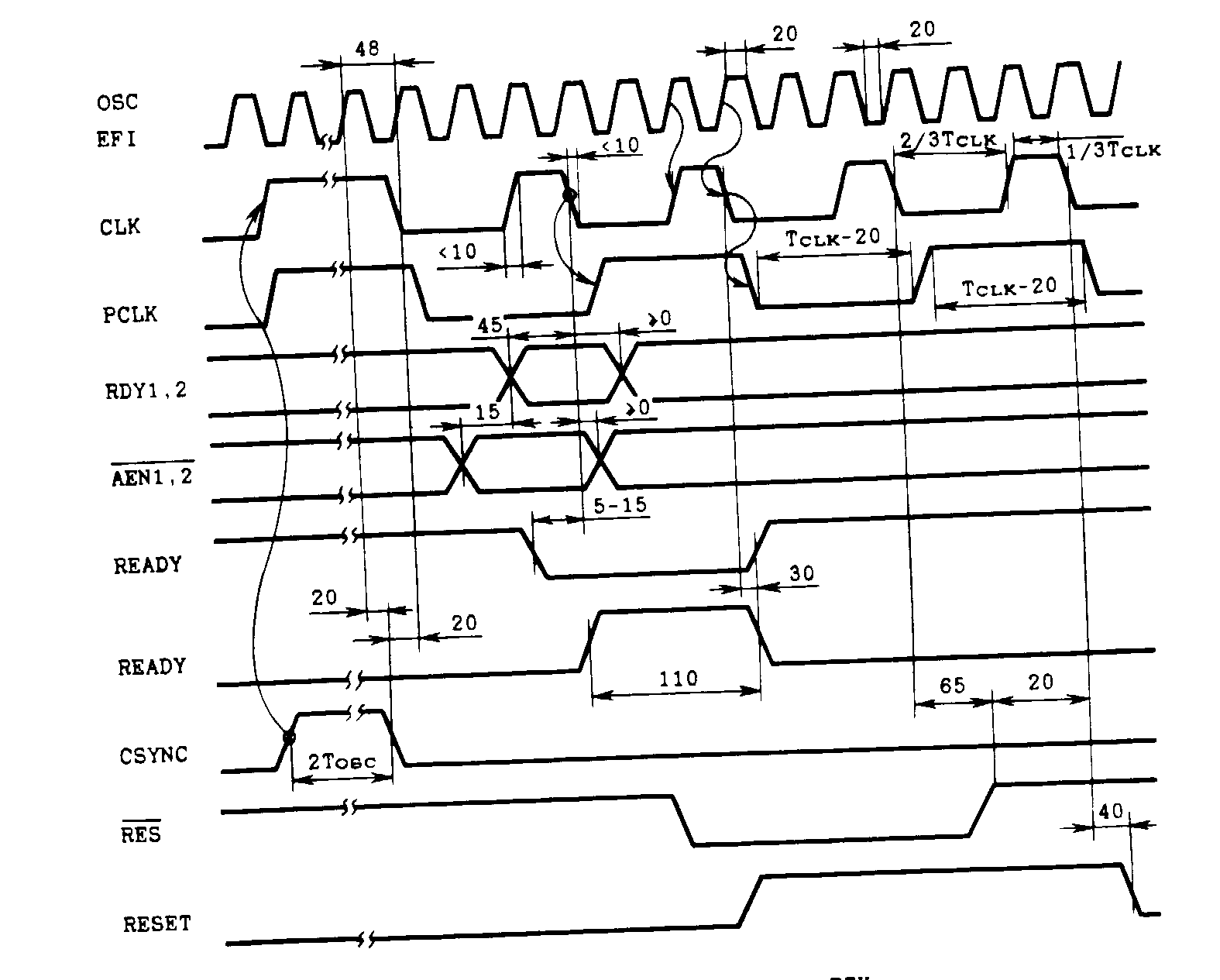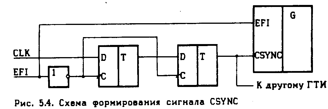 Схема формирования тактовых импульсов имеет специальный вход синхронизации (CSYNC), с помощью которого возможно синхронизировать работу нескольких ГТИ, входящих в систему. Такая синхронизация осуществляется с помощью двух D-триггеров по входам СSYNC и EFI (рис. 14). Следует отметить, что если ГТИ работает в режиме внешнего генератора, то внутренний генератор может работать независимо (вход OSC независим от CLK и PCLK и асинхронен им).