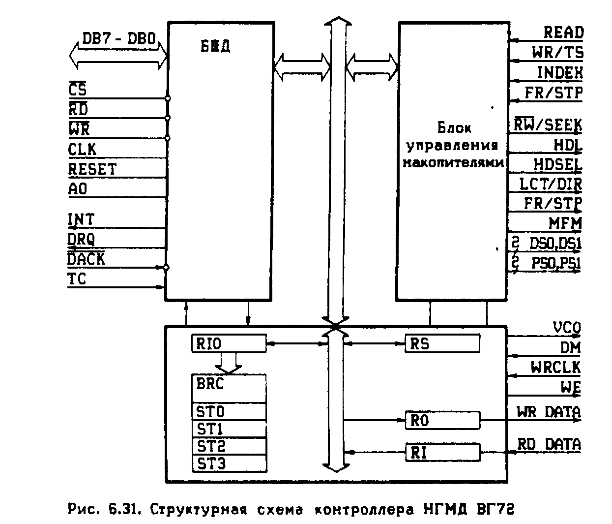 Кроме перечисленных регистров контроллер имеет блок регистров BRC для хранения кода команды и служебной информации (атрибутов), необходимой для выполнения команд. В блоке BRC можно выделить четыре регистра (ST3 — STO), несущие информацию о состоянии контроллера и дисковода при выполнении команд. Кроме того, контроллер имеет схему обнаружения адресного маркера, что упрощает реализацию контура фазовой автоподстройки.