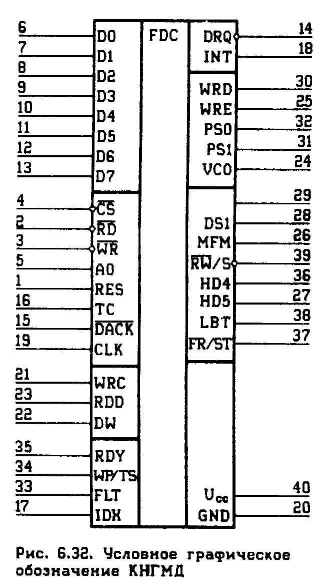 Прием/передача данных может осуществляться контроллером в двух режимах: ПДП и прерывания. В режиме ПДП необходимо дополнительно использовать контроллер ПДП К1810ВГ37, вырабатывающий сигнал запроса на ПДП DRQ и принимающий сигналы подтверждения DACK и конца ПДП (ТС). В режиме прерывания контроллер формирует сигналы запроса на прерывание INT при пересылке каждого байта между контроллером и ЦП, предоставляя возможность управления обменом подпрограмме ЦП.