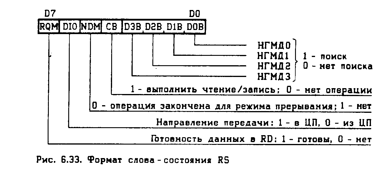 Блок управления контроллером включает несколько регистров специального назначения. Регистр входных/выходных данных RIO адресуется при А0=1 и доступен для чтения и записи со стороны ЦП. С помощью этого регистра осуществляется обмен данными между контроллером и ЦП, а также служебной информацией — загрузкой команды и чтением из регистров состояний и указателей. Запись и чтение служебной информации осуществляется в определенной последовательности, в соответствии со структурой команд. Основной регистр состояния RS доступен только для операций чтения и содержит разряды, определяющие состояние контроллера по взаимодействию с НГМД и ЦП. Формат слова состояния RS показан на рис. 17. Содержимое его можно прочитать в любое время по команде ввода с адресом, формирующим сигнал А0=0. Разряды D3 — DO указывают на выполнение команды поиска; D4 — на выполнение контроллером операции чтения/записи; D5 используется для режима прерывания и указывает на завершение операции обмена данными между контроллером и ЦП, D6 определяет направление передачи данных (от ЦП или к ЦП); D7 устанавливается при готовности регистра данных RIO принять или передать данные. Входной регистр RI и выходной регистр RO – регистры приема/передачи данных в последовательном коде. Программно они недоступны. При приеме данных от накопителя данные отделяются от импульсов синхронизации с помощью “окна данных” DW, которое формируется с помощью внешней схемы фазовой автоподстройки и сигнала синхронизации VCO. При выдаче данных используются сигнал разрешения записи WE и линия управления током записи. Кроме того, для синхронизации работы выходных регистров с работой дисковода используется внешний генератор, формирующий импульсы записи WR CLK. Скорость приема/передачи байта составляет 32 мкс (по 4 мкс на бит).