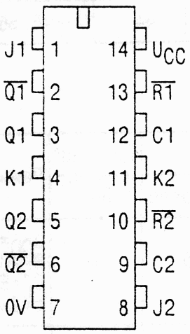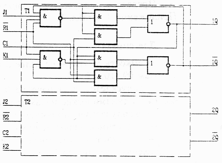 Основу последовательностных цифровых структур составляют триггеры различных типов, которые могут использоваться самостоятельно или в составе счетчиков, регистров . . Таким образом конструктивно микросхема КР1533ТВ6 представляет собой два JK-триггера, срабатывающих по отрицательному фронту тактового сигнала, со входами сброса. Низкий уровень напряжения на входе сброса R устанавливает прямой выход Q соответствующего триггера в состояние низкого уровня напряжения вне зависимости от логического состояния на других входах. При наличии на входе сброса напряжения высокого уровня для правильной работы триггера требуется предварительная установка информации по входам J и К относительно отрицательного фронта тактового сигнала, а также