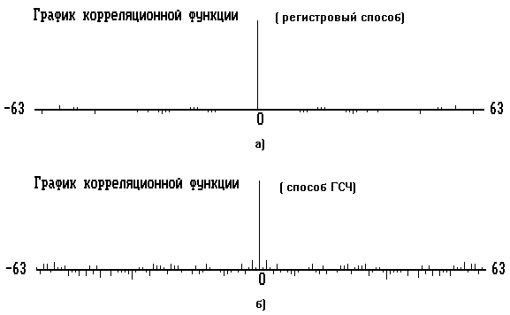 H = p(0)H 0 +p(1)H 1 = 1 бит/символ. О лучших случайных характеристиках можно также судить по графикам АКФ(рисунок 2) : квазислучайная последовательность полученная регистровым способом обладает лучшими корреляционными свойствами (малый размер боковых лепестков, большая удаленность максимального из боковых от нулевого).