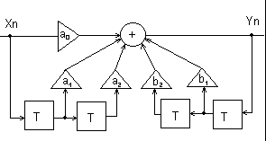откуда выражение для выходного сигнала: y n = a 0 x n + a 1 x n-1 + a 2 x n-1 + b 1 y n-1 + b 2 y n-2 , где x n , y n - сигнал на входе и на выходе соответственно, a i , b i - параметры, описывающие цифровую модель линии.