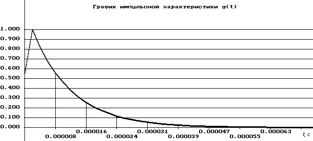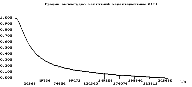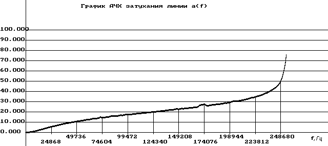 С помощью такой модели можно исследовать различные характеристики системы, варьируя входными сигналами. Например при подачи на вход единичного ступенчатого импульса, на выходе имеем сигнал, соответствующий переходной характеристике линии. С помощью программы “liniam” исследуем переходную и импульсную характеристики линии, амплитудно-частотную характеристику линии A(w) и частотную характеристику затухания a(w) . Задавая удельные значения L = 0.6 мГн/км, С=45 нФ/км, R л = 280 Ом/км (для кабеля типа ТПП диаметром 0.4 мм) ,при сопротивлении нагрузки 600 Ом и принимая длину линии 5 км построим графики импульсной и переходной характеристики, АЧХ и ЧХ затухания (рисунок 3,4,5,6), приведя в таблице 2 численные значения этих характеристик.