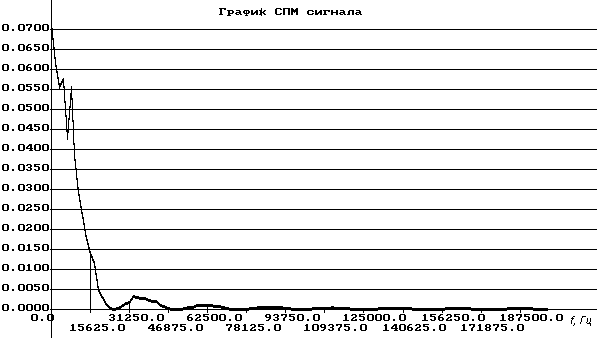рисунок 9 Параметры СПМ сигнала: Эквивалентная ширина СПМ равна 11740 Гц Нижняя граничная частота эфф-ой полосы: F1=0 Гц Верхняя граничная частота эфф-ой полосы: F2=17188 Гц Ширина эффективной полосы СПМ равна: 17188 Средняя частота эффективной полосы: 8594 Из приведенных данных следует, что параметры сигнала согласуются с частотным диапазоном линии. Значения спектральной плотности мощности приведены в таблице 3. Таблица 3