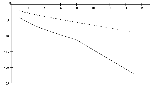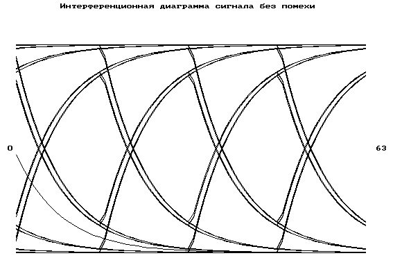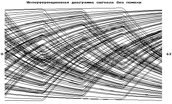 4. Исследование искажений сигнала в линии. Для устойчивого приема сигнала необходимо, чтобы интерференционные искажения сигнала в линии не превышали допустимого значения на данной скорости передачи. С помощью программы “Skrivlen” определим величину интерференционных искажений. Для этого приведем на рисунке 10 интерференционную диаграмму сигнала (расчет ведем для длины линии 5 км, диаметра кабеля 0,4 мм, отношение сигнал/шум - 10 Дб и скорости передачи сигнала 17188 Бод - такая эффективная полоса СПМ сигнала):